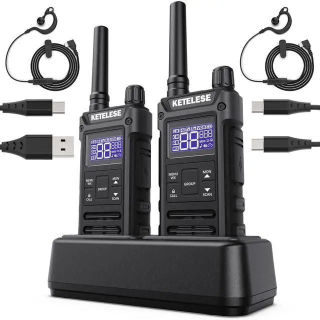 What's more, a corn can remove the battery cover and replace a new battery ^^ Easy for BeginnersPalm size; Light weight; Push to talk (PTT); One key group talk, 10 call tones; Keypad lock; LCD screen with backlight, Belt clip with lanyard hoop; Convenient Type-C charging ^^ Lifetime After-sales ServiceKETELESE provides over 5 years warranty to walkie talkies and lifetime after-sales service, contact us for any queries/problems before/after sales, we will refund or send replacement at first time