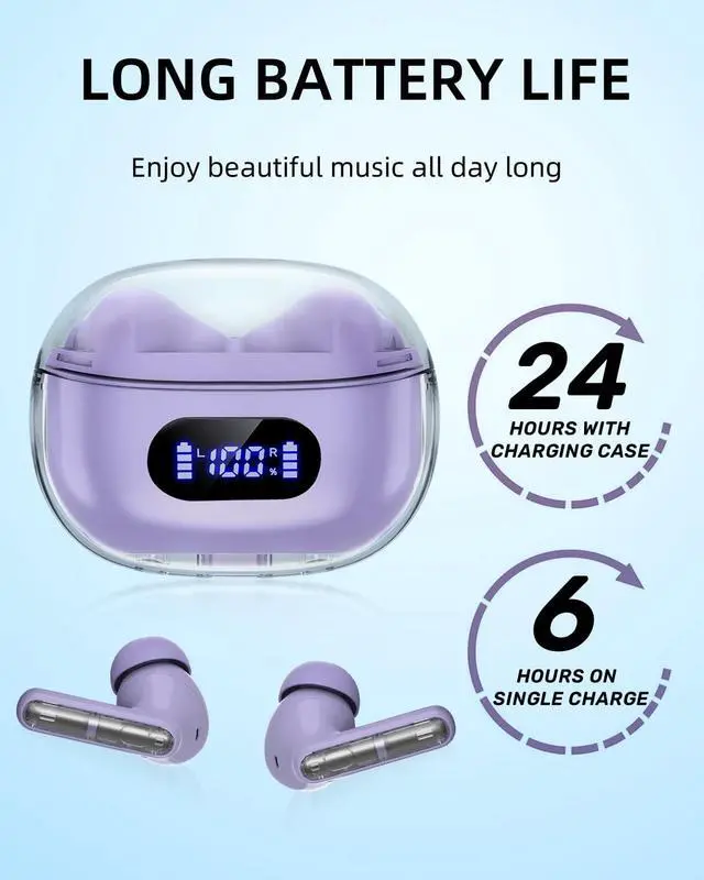 ^^ [Extended Battery Life]: Enjoy up to 6 hours of continuous playback on a single charge, thanks to our BYDTOOPCBD purple ear buds wireless bluetooth earbuds high-capacity batteries. The included charging case provides an additional 4 recharges, extending your total listening time to 30 hours. The LED indicators on the case keep you informed of the battery status, and the USB-C fast charging feature lets you quickly power up when you're on the go.