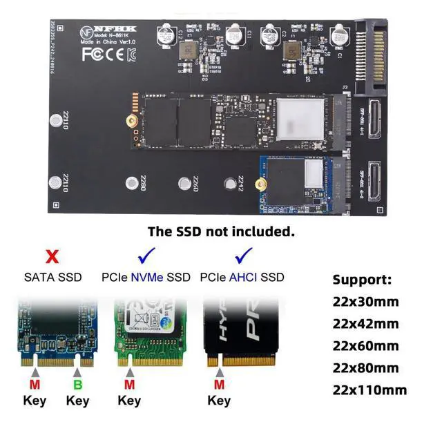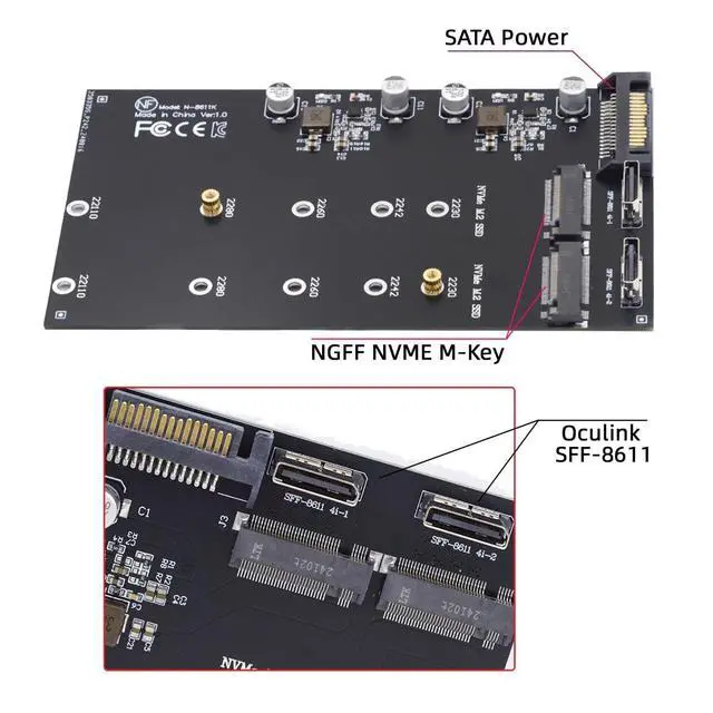 Oculink 4x connectors are internal and external small form factor PCI-E connectors and cables optimized for the client and market. ^^ Hyper Kit Storage controller, Ultra PCI-E oculink interface (PCIe 4.0 / 5.0 x4), The card work for PCI-E NVME SSD. (Not work for SAS or Slimeline SAS HD) ^^ This M. 2 converter enables belowing applications: Dual M. 2 NVME PCIe SSD in 2280, 2260, 2242 and 2230 format can be connected, The converter can be installed into the system internally through Dual SFF-8611/8612 oculink interface. and the SATA power is required. ^^ The converter work for one oculink and one NVME, or Two oculink and two NVME; This oculink M. 2 converter can't convert NVME to SATA/SAS, also can't covert NGFF/SATA/SAS to Oculink. ^^ It transmits PCI Express 4.0 signals using the PCIE protocol; Support PCIE 4.0 data transmission, Data transfer rate up to 64Gbps, Support connecting GPU graphics card, SSD, expansion card, etc., backward compatible with PCIE 3.0.