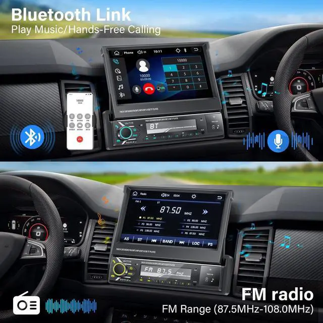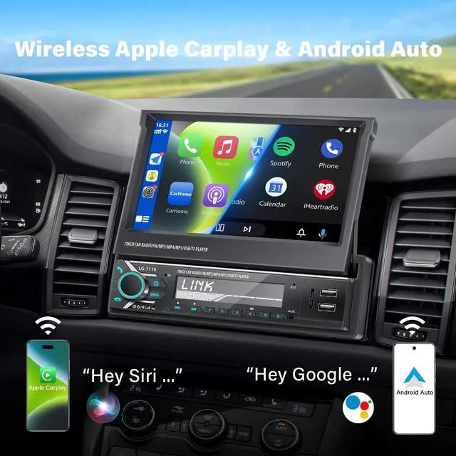 Wired/Wireless Apple Carplay and Android Auto This single din car radio connects to your iPhone or Android phone to access maps, music, contacts, and more. CarPlay and Android Auto functions can be used either wired or wirelessly (Bluetooth wireless connection), so you can drive with peace of mind. The voice feature lets you drive hands-free so you can enjoy your journey. ^^ 7-inch Retractable Flip Screen and Mirror ConnectionThis manually/automatically retractable car stereo has a 7-inch HD touchscreen that allows you to mirror your phone's apps onto the HD display for big-screen viewing.