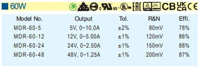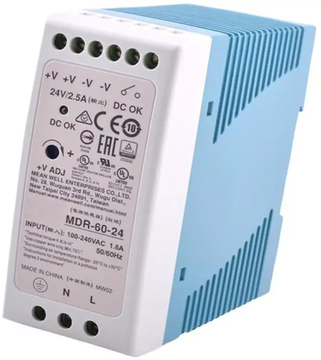 MDR-60-24 24V 2.5A 60W Switching Power Supply with Wide 85-264VAC Input, Adjustable Output for Industrial Equipment & Automation Systems