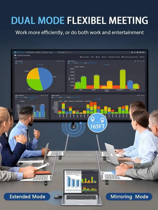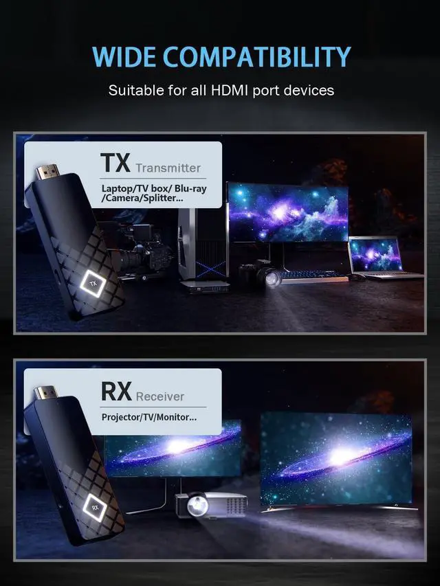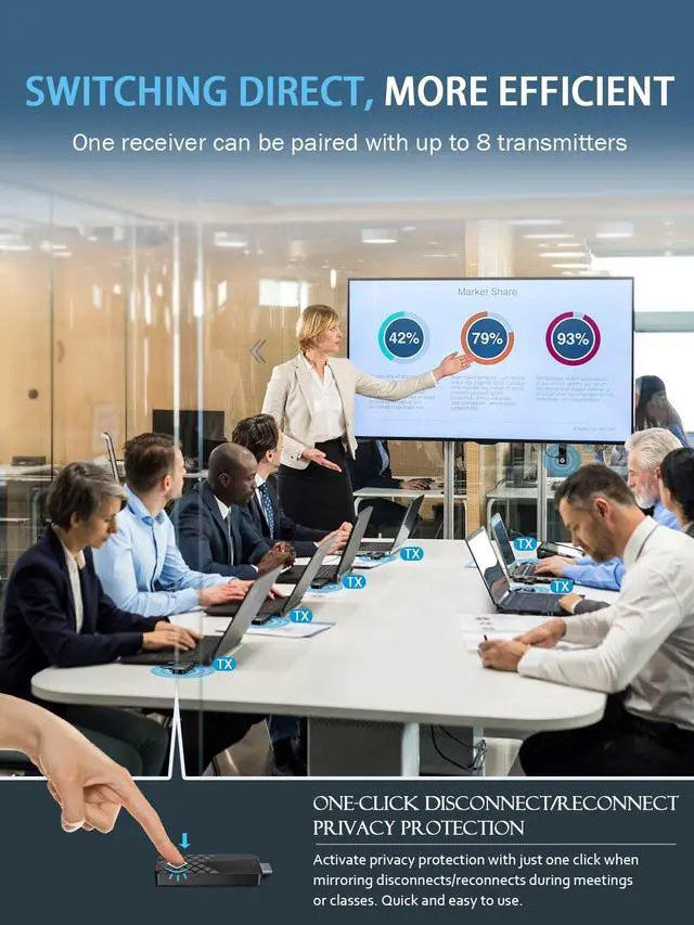 [CAN NOT USED ALONE] One receiver can be paired with up to 8 transmitters. In multi-person meetings, TX1 clicked once toestablish a connection, then TX2 clicked onceto pair with RX. Pressing it quickly switches tothe next screen, saving time and increasingefficiency. ^^ [Simple Plug & Play] No app, WiFi, or Bluetooth needed. Connect the transmitter and receiver to your devices for a One-Click connection, eliminating cable clutter and enabling flexible placement of devices and displays. Even the elderly and children can easily use it. It is designed to be small and portable for on-the-go presentations or entertainment, saving time and maintaining a clean, aesthetically pleasing space.