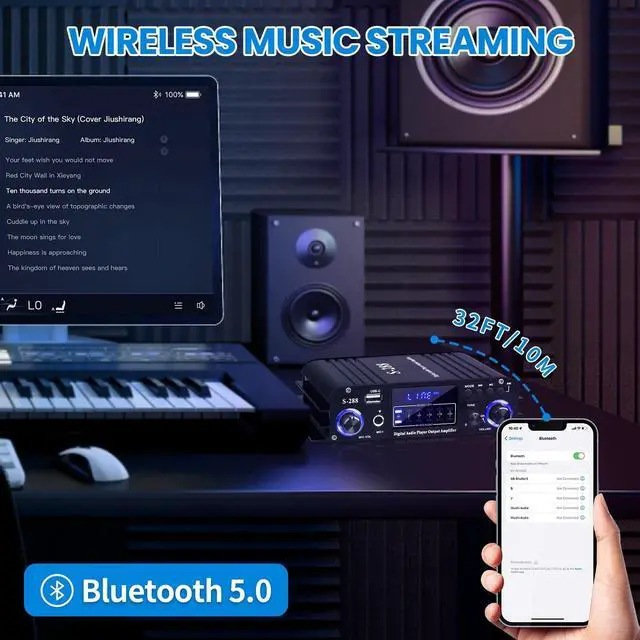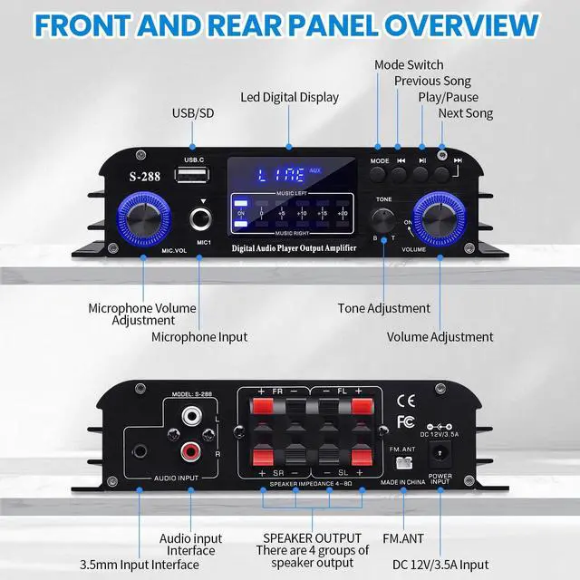 Amplificador 4 Canales, 5.0 HiFi Stereo Bluetooth Amplifier, 40W x 4, 600W max, with AUX/USB/FM/MIC, Class d Home Audio Receivers Include RC and 12V 5A Power Adapter
