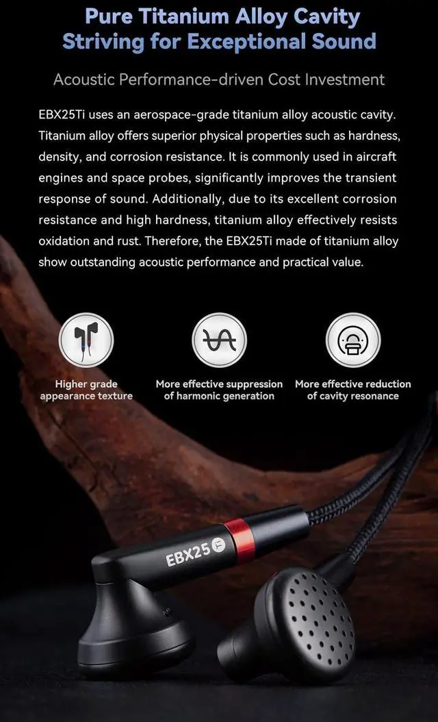 Aerospace-Grade Titanium Alloy CavityAwarded VGP 2025, the EBX25Ti flagship titanium alloy cavity dynamic earbud wired headphones offer durability, corrosion resistance, and low distortion, delivering clear sound for audiophiles and earphones for musicians ^^ 14.2 mm Dome Beryllium-Plated Diaphragm 14.2 mm beryllium-plated diaphragm powers these in ear monitor units, producing powerful bass, clear mids, and crisp highsideal for immersive music, iem gaming, and live performance use. ^^ Premium 6N OCC & Silver-Plated Copper CableThese wired earbuds include a premium 6N OCC and silver-plated copper MMCX detachable cable, ensuring excellent separation, wide soundstage, and accurate reproduction for in ear monitor earphones and studio sessions.