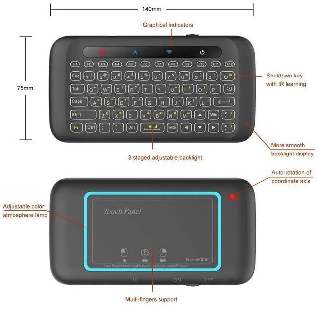 Note: If you find your product stopping working a few minutes later, probably because it get into the Auto-sleep modes, Tap any keys to wake it up. ^^ Auto sleep and wake up mode & IR LearingNo need to press any key, this mini wireless keyboard will auto wake up with backlight when you pick up. Build-in IR learning, you can learn and control your TV Box shutdown with this remote. ^^ Rechargeable Design & BacklitQWERTY Keyboard With 3-Level backlight, TouchPad with Colorful breathing light. you can enjoy use in the dark night easily. Build-in 300 MAh removable Li-ion battery enough for you use and keep several weeks. ^^ Stable signal and Wide CompatibilityThe wireless range is up to 10 meters( 32.8 ft), the signal is stable. Just plug and play. No install software needed. It is compatible with PC, Laptop, Projector, Mac OS, Linux, HTPC, IPTV, Google Android Smart TV Box, Windows 2000 XP /Vista/7/8/10. ^^ BUY RISK-FREEUnconditional 30days Money Back and Lifetime After Sales Service. Please do not hesitate to contact us if you are not satisfied with our Mini Wireless Keyboard.