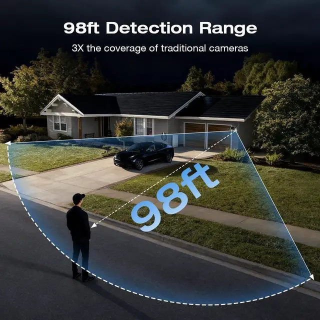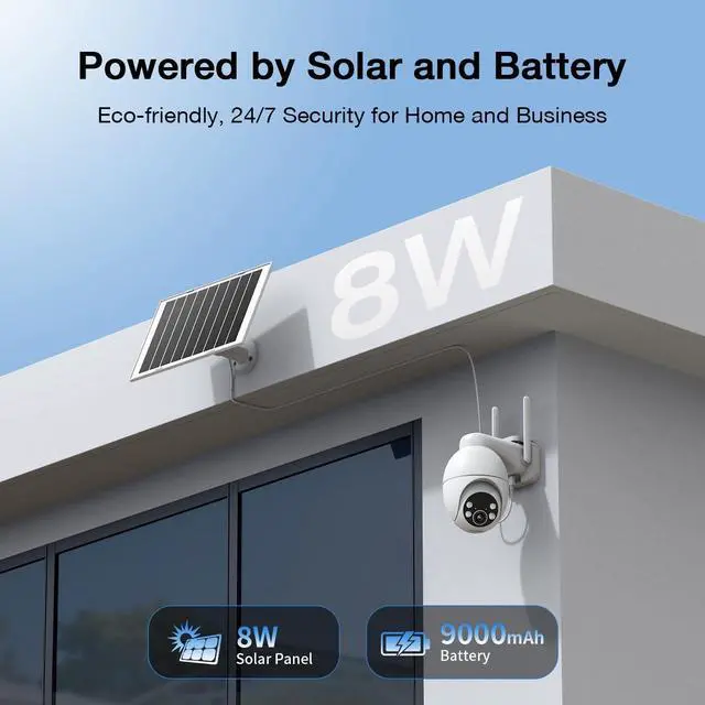 AI Smart Detection: With our security cameras wireless outdoor, you get the peace of mind that comes with extended coverage. Its AI detection range spans up to 98ft three times the distance of normal solar cameras. Whether its a vehicle approaching or someone walking near your driveway, the wireless outdoor camera instantly tracks and records, protecting your home from further away. ^^ High-Capacity Battery and 8W