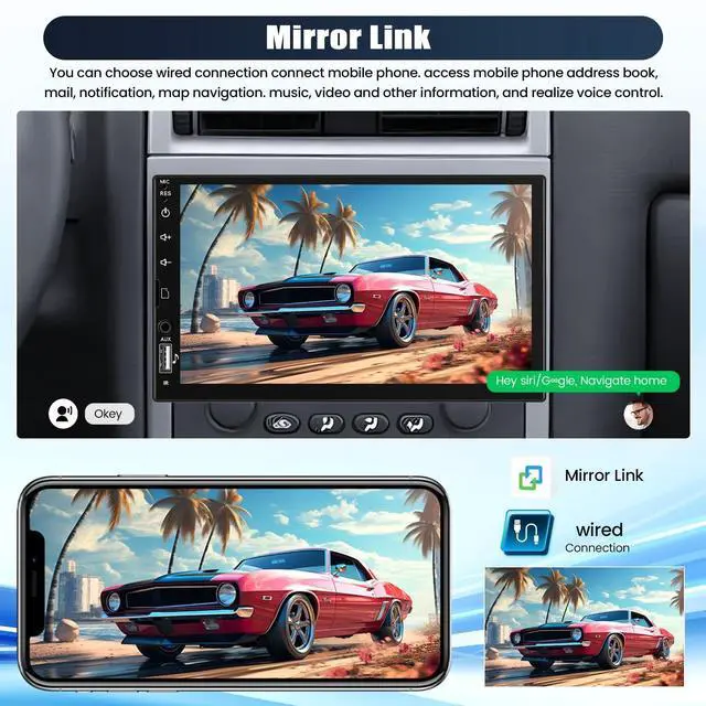 Installation size: 183*50 mm, universal for single din cars, can fit most vehicle ^^ Single Din Car Stereo with Mirror Link&EQ7 Inch touchscreen car radio through original USB cable of your phone to synchronize the phone screen. Support subwoofer output and EQ Settings with the band graphic equalizer ^^ Bluetooth&FM RadioThe 1 din car mp5 player supports bluetooth can connect to phone, and handsfree calling, more safer when driving car, bluetooth music play. FM radio with high quality stereo that can set channels fully automatically, semi-automatically and precisely ^^ Multi-Interface Car Stereo&MicrophoneSingle din car stereo has AUX audio input interface, which can be connected to MP3, mobile phone, music player and other audio inputs. The USB/SD interface can charge mobile phones, store files. The external microphone, the radio effect is better, the sound is clearer ^^ Rear View Camera&SWCThis single din car radio come with a rear view camera, support AHD high-definition camera image input, when the vehicle shifts into reversethe car radio screen will automatically display the reverse image. and support Steering wheel control, through it you can control the functions you need by steering wheel, more convenient