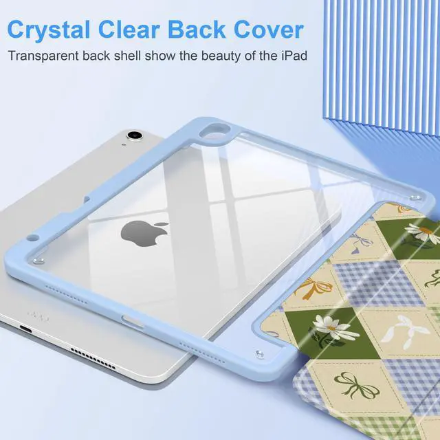 Two Viewing Modes: The magnetic trifold cover folds into stable viewing and typing angles, perfect for watching videos, working, drawing, or studying. ^^ Clear Acrylic Back with