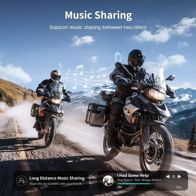 ^^ [Triple Noise Cancellation & Music Sharing & HIFI Speakers] The T1 helmet bluetooth headset features triple noise-canceling technology (DSP/CVC/built-in mics) that effectively eliminates ambient noise to ensure loud and clear voice transmission. The music-sharing mode lets you and your riding partner enjoy music together, while the standard high-fidelity stereo speakers deliver rich, dynamic sound. ^^ [Microphone Mute & FM Radio & Easy-to-operate button] The T1 motorcycle communication systems features microphone mute function (allowing you to disable the mic during intercom calls or phone conversations) and includes built-in FM radio capability. Its innovative tactile scroll wheel design enables easy blind operation while riding with gloves on.