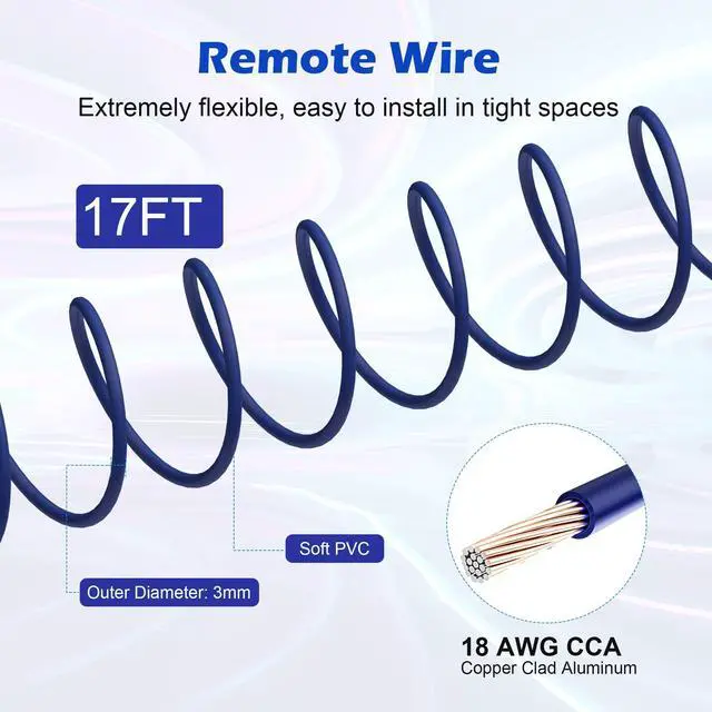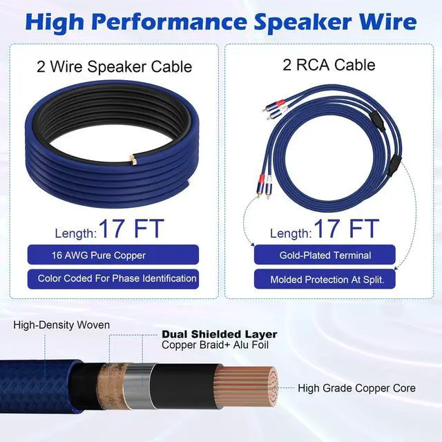 Premium Cable Set: Equipped with 4 AWG CCA (412/ 0.254 mm) 17 FT heavy-duty power wire (transparent blue) and 4 AWG 3 FT heavy-duty ground wire (transparent brown), OD 8.7 mm, Ultra-Flex high-flexibility insulation designed to withstand oil and extreme temperatures (-40C to 105C), durable and long-lastingIncludes 17 FT dual-shielded dual-channel pure copper OFC RCA audio cable with gold-plated connectors to effectively reduce interference and ensure clear and accurate sound output17 FT 16 AWG OFC speaker wire provides distortion-free audio transmission for subwoofers and speakersComes with 17 FT 18 AWG control Remote wire for easy connection between head unit and amplifier ^^