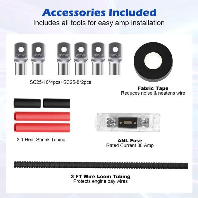 Easy Installation: One kit does it all, with a refined and durable carrying-case style packaging box that includes all tools needed for amplifier installation; all essentials are packaged together, eliminating the need to purchase extra parts and saving time on searching for accessories, making installation fast and effortless; durable materials and strong construction ensure a longer service life; color-coded wire jackets for easy identification: power wire (transparent blue), ground wire (transparent brown) to improve installation efficiency; highly flexible wire jacket design allows easy routing in tight spaces ^^