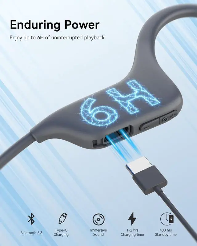 USB-C Charging: Never worry about power drainage during your day. These bone conduction earbuds offer up to 6-8 hours of continuous playback on a single charge. The USB-C universal charging interface meets the needs of more users. The running headphones also feature a 240-hour standby mode, making them ready for use whenever you need them. Perfect for long training, travel, or daily commutes ^^