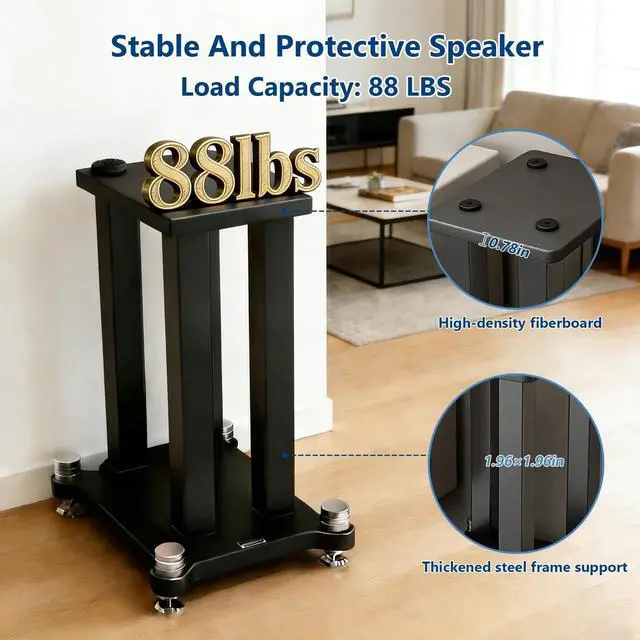 Superior Stability and Support -- Satellite speaker stands Constructed from high-quality carbon steel and MDF, the speaker stand can support up to 88 lbs per unit, compatible with most bookshelf speakers, satellite speakers, and studio monitor speakers, ensuring equipment safety and stability