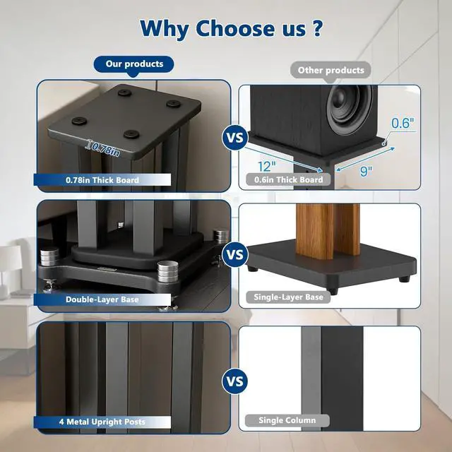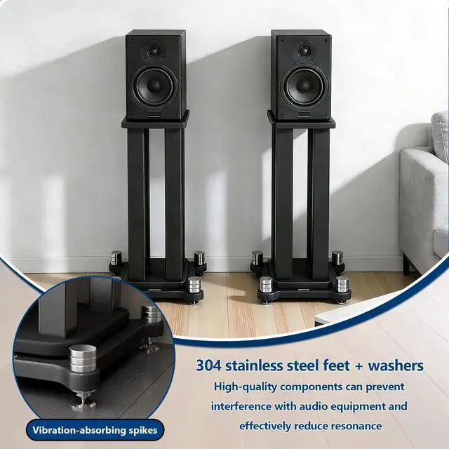 304 Stainless Steel Feet -- Bookshelf speaker stands features a double-layered, thickened base with stainless steel feet running through the en