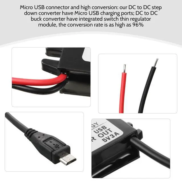 Output power: 15W max ^^ Micro USB connector and high conversion: our DC to DC converters have Micro USB charging ports; DC to DC buck converter has an integrated switch thin regulator module, and the conversion rate is as high as 96 percent ^^