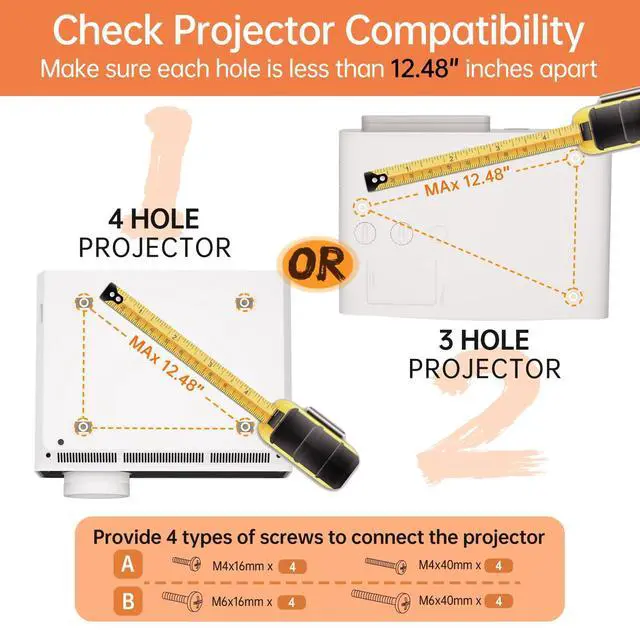Projector Compatibility: This projector ceiling mount supports most projectors on the market, with mounting holes on the back spaced 12.5 inches or less apart. The mount can be used on flat or sloped ceilings ^^