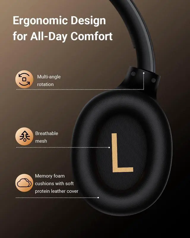A 10-minute quick charge gives 5 hours, and a 3.5 mm cable lets you switch to wired mode anytime ^^ All Day ComfortHS1 Wireless Bluetooth Headphones over ear feature premium protein leather and slow-rebound memory foam earcups, providing a soft, cushioned embrace. The 90 swiveling earcups and self-adjusting, flexible headband ensure a snug, personalized fit ^^ AI-Enhanced 5-Mic ENC for Clear Calls Dual-ear 5-mic system (2 on the left, 3 on the right) with hybrid ENC and AI neural network algorithm intelligently reduces ambient and wind noise, delivering crystal-clear call quality in any environment ^^ Bluetooth Version 5.4S tay connected with the latest Bluetooth 5.4 in these Bluetooth headphones.