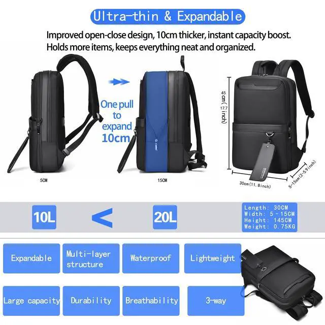 Innovative Smart Expandable Design: The innovative expandable structure lets the backpack switch freely between 30x5x45cm ultra thin portable mode and 30x15x45cm 20 liter large capacity mode. It meets different needs from carrying laptop books and documents for daily work to adding clothes and supplies for short trips, achieving the ultimate convenience of one bag for two uses. ^^ Efficient and Organized