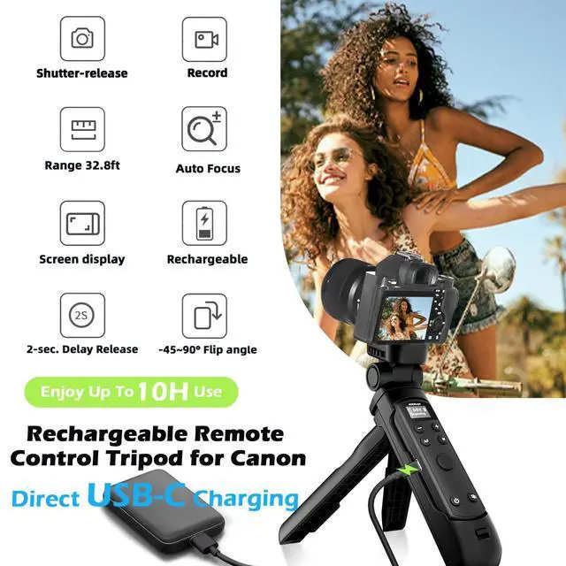 Say goodbye to disposable batteries ^^ This Wireless vlogging shooting grip tripod with remote is compatible with Canon EOS R1, R3, R5 / R5 II / R5C* (R5C does not support remote video shooting), R6 / R6 II, R8, R10, R50, R100, R, Ra, RP, M6 Mark II, M50 / M50 Mark II / M200, 6D Mark II, 77D, 90D, Rebel T7i / T8i, SL2 / SL3, PowerShot G7 X Mark III, G5 X Mark II, SX70 HS, V1, V10.