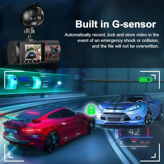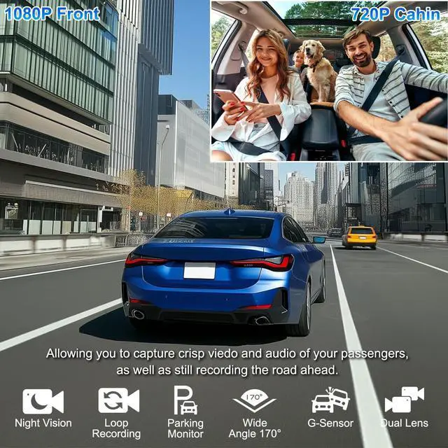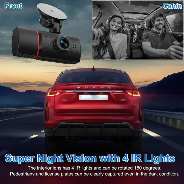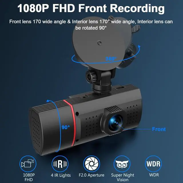 ^^ Easy-to-Install Dual Dash CamThis dual-camera dash cam is easy to install and plug-and-play. Simply plug the power cord into your car's cigarette lighter, and the front and inside cameras will automatically start recording simultaneously. The user interface is intuitive and easy to use. The inside car camera supports 90 rotation for flexible adjustment of the monitoring angle. ^^ Emergency Incident LockingThis dashcam's front and interior cameras can simultaneously record high-definition footage of the road ahead and the complete interior of the vehicle. This dashcam also features a built-in G-Sensor collision detection system.