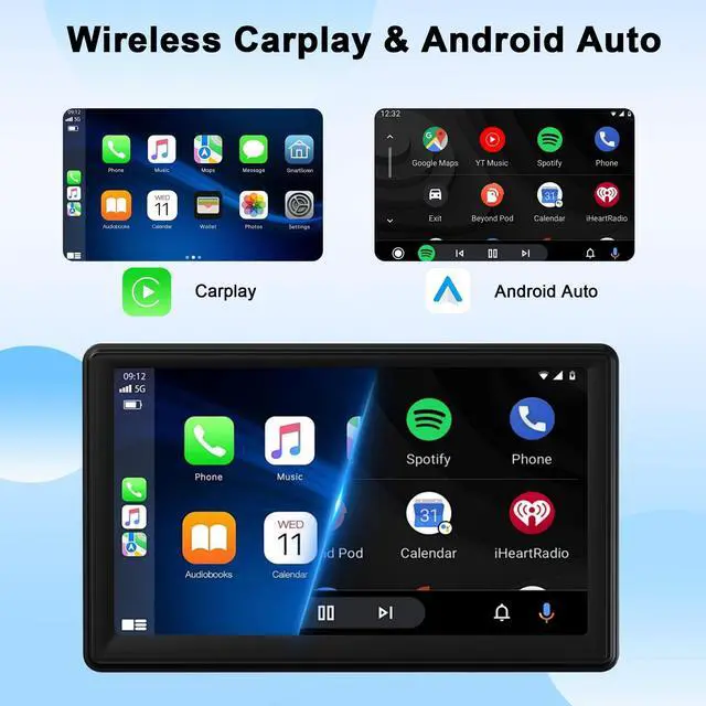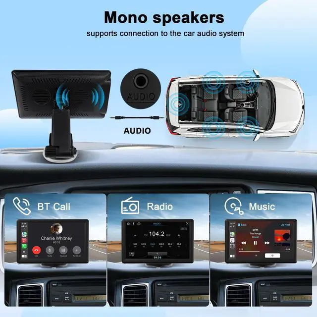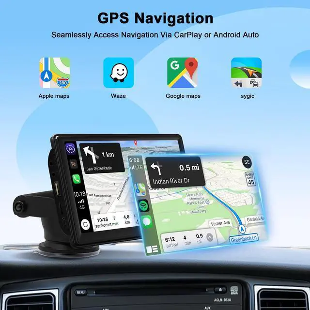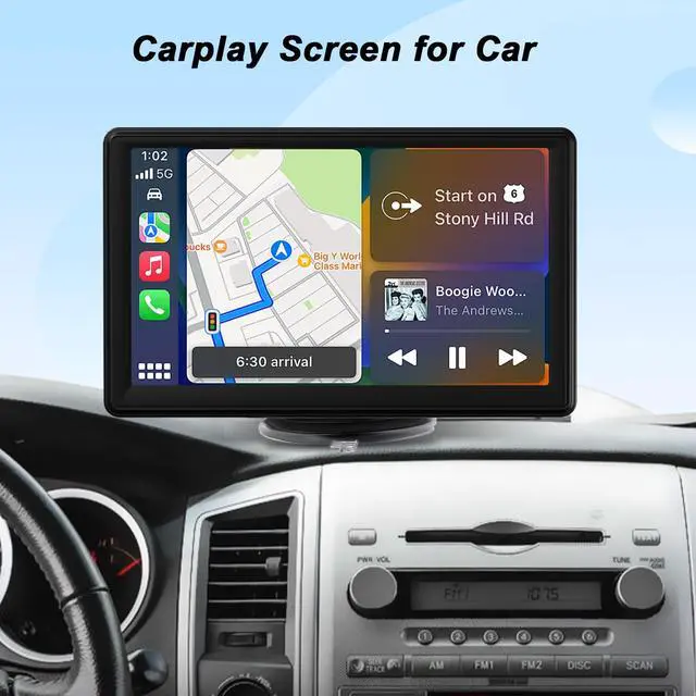 [ Plug & Play CarPlay Screen for Cars ] Compatible with most vehicle models. Designed for effortless installation on the dashboard or windscreen, featuring a rotatable adjustable bracket. Plugs directly into the vehicle's cigarette lighter socket without requiring removal of the console. ^^ [ Wireless Carplay & Android Auto ] Supports CarPlay and Android Auto, connecting your smartphone to automatically access GPS, music, calls and messages on the touchscreen. Use voice control via Siri or Google Assistant, allowing you to keep your focus on the road. ^^ [ 7 HD Touchscreen & Mirror Link ] The portable 7-inch HD touchscreen delivers crisp visuals.