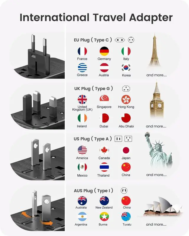 Travel: This international adapter features 4 interchangeable plugs and supports 100V-250V voltage, making it suitable for over 200 countries;