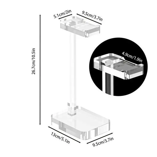 Whether for your gaming room, workstation, or bedroom dresser, this stand keeps your headphones neatly displayed and your space clutter-free. ^^ Minimalist Style with Premium Touch Measuring 3.74" x 5.11" x 10.5", this acrylic headset holder pairs timeless transparency with compact style. Matches seamlessly with modern, minimalist, and luxury decor styles or pair it with other acrylic desk accessories for a cohesive look. ^^ What You Get - 1 x Headphone Stand, 4 x Self-Adhesive Rubber Feet, 1 x User manual and friendly customer service.