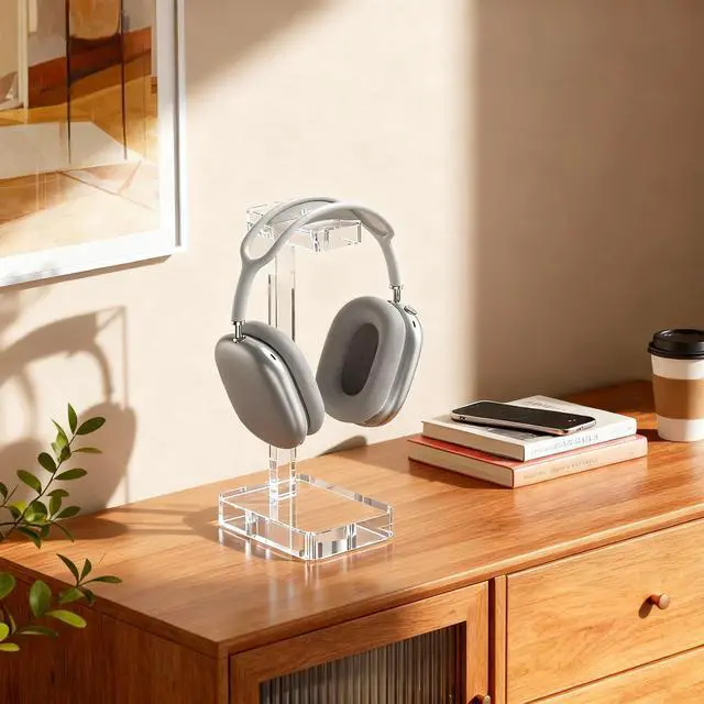 Elegant & Sturdy Design Crafted from premium crystal-clear solid acrylic block, this headphone stand combines beauty and durability. Its thick & heavy base ensures stability, while the modern design complements any gaming setup, home office, or recording studio. ^^ Protects Your Headphones The curved acrylic top hanger gently supports your headsets headband, preventing pressure dents, deformation, or scratches. Keep your headphones safe, accessible, and always ready to use. ^^ Universal Compatibility Designed to hold all headphone sizes and brands. Perfect for both wired and wireless headphones and headsets.