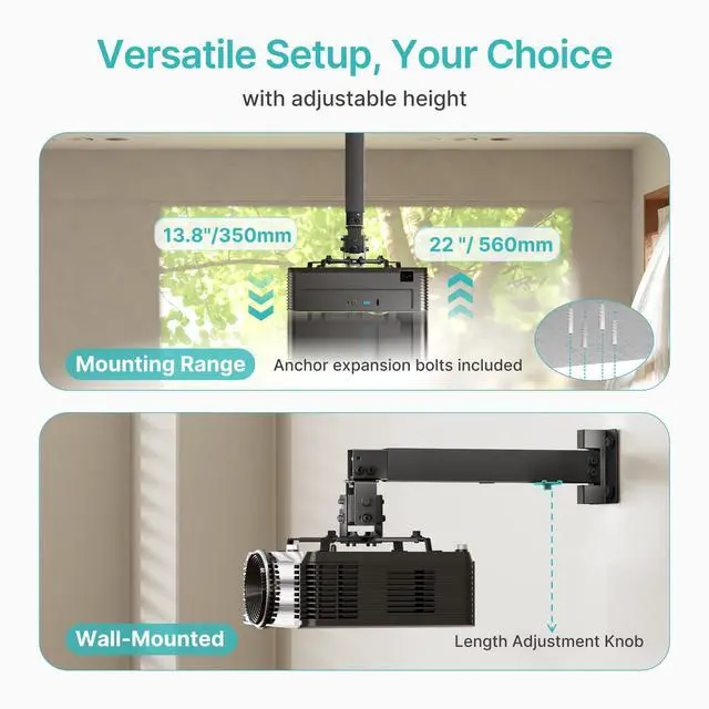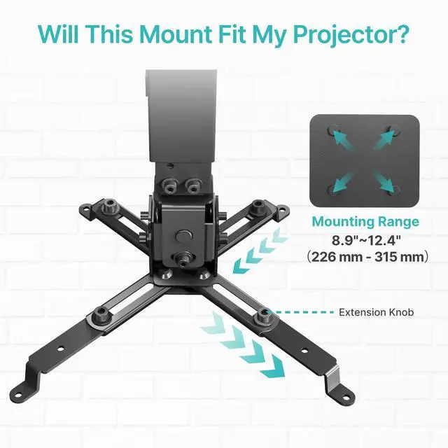 Ceiling extension range: 430650mm ( 16.9" 25.6" ); wall mounting range: 225316mm, ideal for flexible positioning. ^^ WIDE COMPATIBILITY PROJECTOR BRACKETCompatible with most projector models including compatible with Epson, BenQ, Optoma, Vankyo, Acer, ViewSonic, and more. Fits most projectors with mounting hole patterns between 8.85" and 12.44" please check your projectors specifications before purchase to save your time. ^^ QUICK INSTALLATION & CABLE MANAGEMENTIncludes all hardware, a drilling template, and step-by-step instructions. Built-in cable management keeps cords tidy for a clean, professional look in your home theater or conference room.