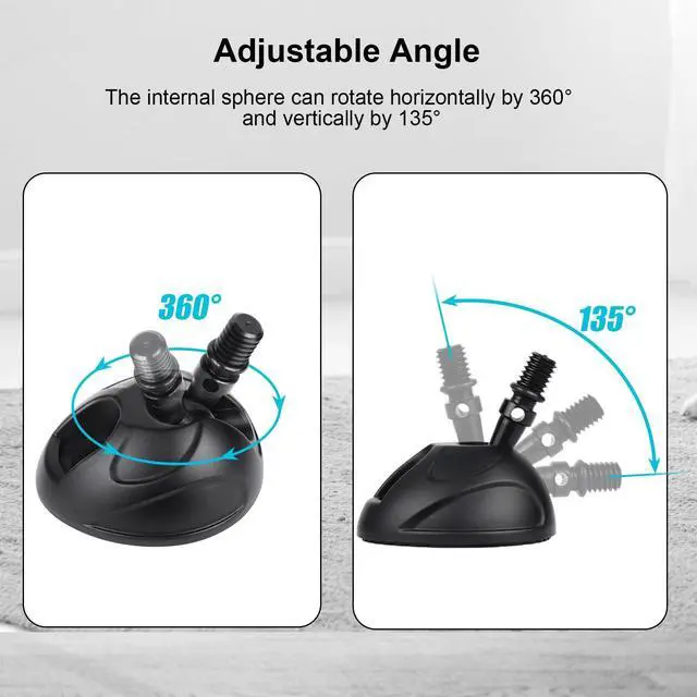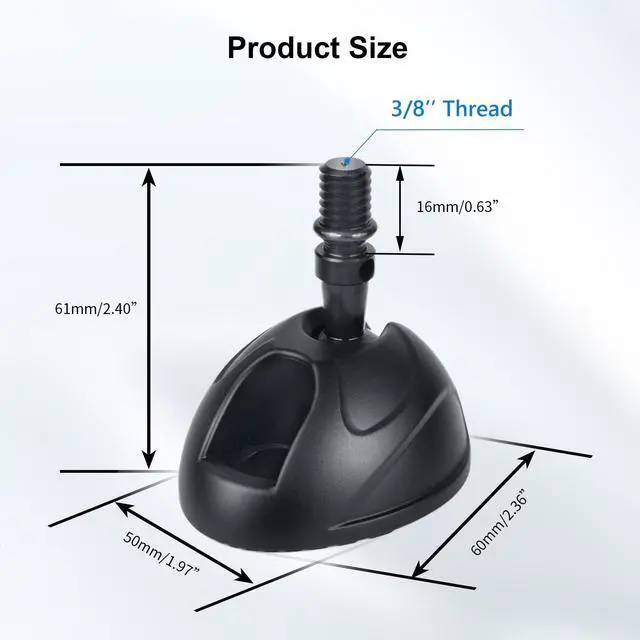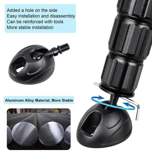 ALUMINUM ALLOY MATERIALMade of aluminum alloy material, it has better quality, stability, and texture than rubber foot pads. ^^ ADJUSTABLE ANGLE&SIZEUse a ball head design, the internal sphere can totate 135. The max bottom diameter of the rubber foot pad is 2.36 in/60mm, heighs 2.40 in/61mm and its connection screw is 3/8". ^^ MORE STABLE INSTALLATIONThere is a hole on the side which can be reinforced with an allen key (NOT included) to achieve easy installation and disassembly. ^^ ANTI-SLIPOval design and small bumps design ensure the tripod feet don't move about on flat surfaces and even sandy terrain.