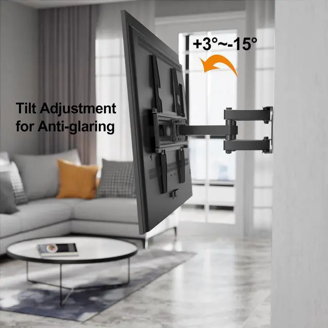 Adjust your TV from 2.6 to 16 inches from the wall and swivel it 60 to the left or right, ensuring you can always find the perfect angle, no matter where you're sitting. The +3~-15 tilt function also helps reduce glare and improves viewing comfort, with a 3 level adjustment. The universal VESA compatibility (up to 600x400mm) ensures that this mount fits most TV brands, providing a versatile solution for all your mounting needs. With easy-to-follow installation instructions and all necessary hardware included, this mount can be quickly installed on wood studs, concrete, or drywall.