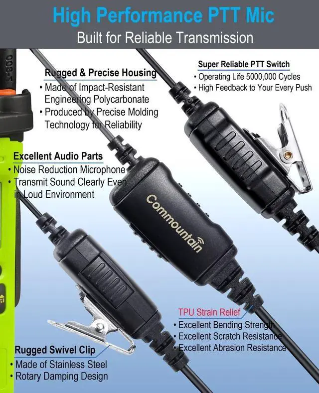 Commountain Single Wire Surveillance Earpiece/Headset KitFeatures: -Single Wire Surveillance kit with Quick-Disconnect Acoustic Tube-Surgical Grade UV Resistant Acoustic Tube, Comfortable & Durable-TPU cable Reinforced by Aramid Fiber, High Strength & Durability-High Performance Speaker & Microphone Enable Sound to Be Transmitted Clearly Even in Loud Environment-Rugged PTT/Mic with High Feedback PTT Switch&Stainless Steel Swivel Clothing Clip-Rugged Connector Built for
