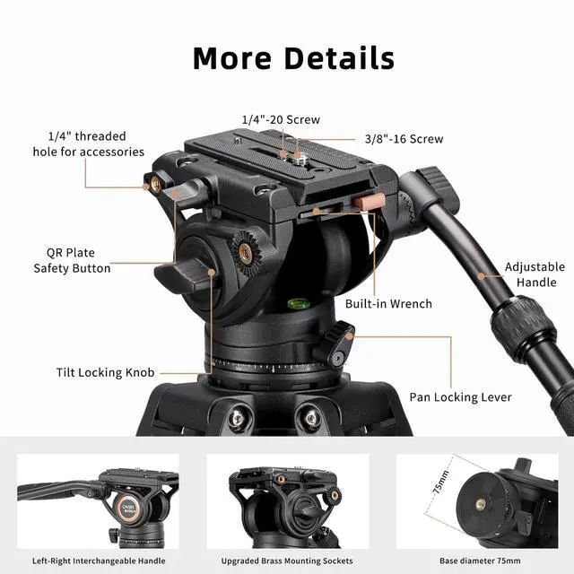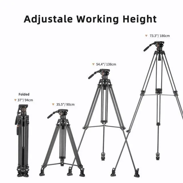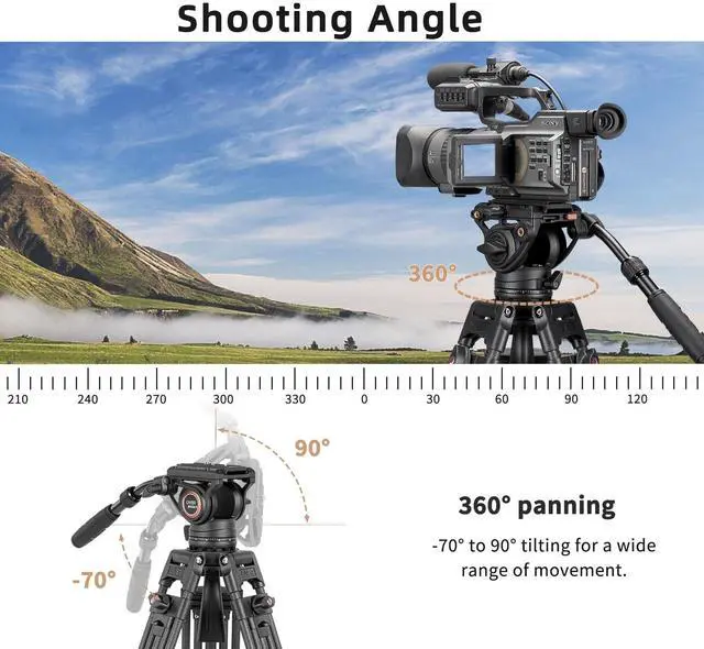 ^^ Tripod Specification: Fluid Head, Camera Tripod Leg, 2 Pan Handles, 17.6 lb Load Capacity, 35.5" to 73.3" Height Range, Tilt Angle +90 / -70, 360 Panning, 75 mm Ball Diameter, Carrying Bag