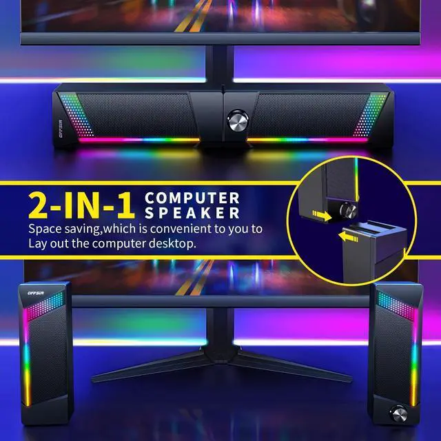 2 in 1 PC SpeakersOFFSIR computer speakers can be a soundbar after easily splicing, innovative 2-in-1 design, which is convenient for you to layout the computer desktop. With compact size, OFFSIR RGB gaming Speakers are ideal for the desktop PC laptop computer.