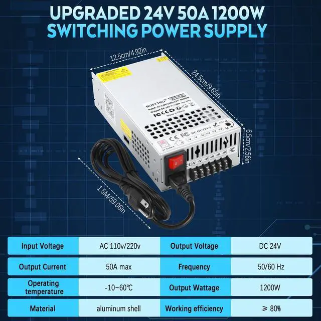Adjustable range: 10%, Adjustable voltage range is 21.6V - 26.4V, which greatly extends its application range and can provide up to 960watts of maximum power with an efficiency of up to 80%. When connecting equipment with high peak variations, such as motors, please select a power supply at least 2 greater than the rated power of the equipment to ensure safety. ^^ AC/DC 24V Power Supply2. 24 volt power supply, Three output channels are available to supply power to multiple load devices. The new BOSYTRO power supply has upgraded its output port, added a power port and power cord, Installation bracket+connection terminal accessory packageeliminating the hassle of having to match a separate power cord and making the connection easier and faster. ^^ Good Heat DissipationThe power transformer is made of porous metal aluminum material, low noise and good and stable heat dissipation. The 1200W power supply with intelligent temperature control fan, only to reach a certain operating temperature when the fan will run, in order to prevent the converter overheating and failure; The operating temperature range of this switching power supply: 14-140. ^^ Multiple Protections24 Volt 50A 1200W dc power supply is strictly tested before leaving the factory, smart chip provides overload auto power off/over voltage auto power off/over heat auto power off/short circuit protection, 110v to 24V converter is RoHS/CE/LVD/EMC safety certified; lead-free process, meets the environmental protection RoHS requirements; provides effective protection for your power safety. ^^ Input Voltage 115V/230VThere is a voltage switch on the side of the 24v dc transformer, we set 115V for American customers at the factory, before using, please check whether the input voltage is 115V, please switch to the local country's voltage to use; to avoid the voltage mismatch damage to the power supply equipment. ^^ Wide Applications The unit converts AC mains power to low voltage DC 24V with a peak power of 50A 1200watts, which works perfectly with most 24V devices under 1200 watts, such as LED strips, 3D printers, ham radios and more. LED power supply will automatically output 0~40A to match your device, the actual current depends on the load, such as 10A (240W), 15A (360W), 20A (480W), 25A (600W) 40A (960W).