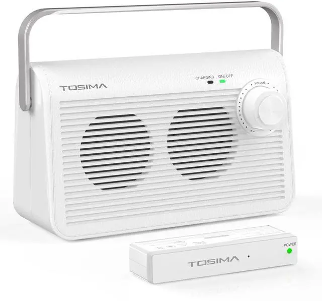 Tosima portable wireless tv soundbox, with 2.4G wireless transfer technology, provides good sound quality with short delay time, delivers natural, crystal clear, stereo TV sound right in front of you, great TV soundbox for seniors who are hard of hearing ^^ The volume control of wireless amplified speaker works independently from your TV, and the adjustable voice enhancement makes each word fully intelligible. ^^ The transferring distance of audio speaker is over 30 meters/100FT, and the transmitter comes with digital audio speakers can match up to 50 pcs of speaker boxes.