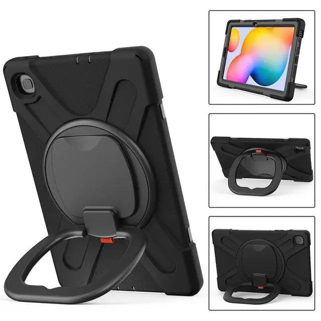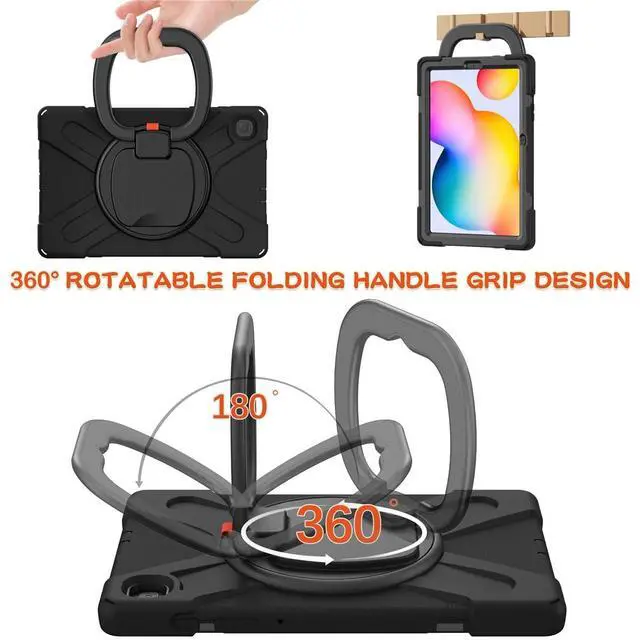 360 Rotation Case for Samsung Galaxy Tab S6 Lite 10.4" Sturdy Cover Rotate Ring Stand Shoulder Carrying Strap Hand Strap Rugged Children Adults Outdoor Case (Black)