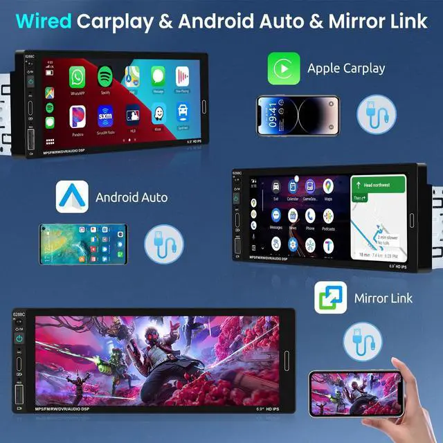 CarPlay & Android Auto & Mirrorlink: The 1 din car stereo with screen offers the wired Car Play and Android Auto. Plus, with voice control through Siri or G-oogle Assistant, effortlessly manage calls, access navigation, control music, and more, all without taking hands off the wheel. Equipped with an extra microphone to ensure your voice commands are heard clearly, enhancing hands-free operation and interaction. Through the USB data cable/wifi connection, you can achieve mirroring the mobilephone screen to the car player ^^