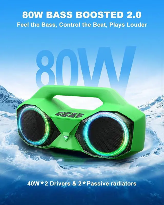 YOUR SOUNDTRACK: The OZJ wireless bluetooth speakers. 80W Peak Bass Boosted 2.0. The powerful bass and crisp highs of loud outdoor speakers turn up the energy at sports events, BBQs, or late-night bonfires. OZJ delivers bold, immersive sound that elevates every moment.