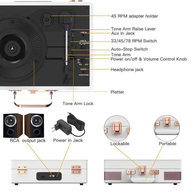 Belt Driven Three-Speed Turntable: This three-speed (33 1/3, 45, 78 RPM) portable turntable features premium upgraded sound quality. It also supports 3 sizes of vinyl records, 7/10/12 inches. If you have records of multiple sizes, try our portable record player instead, which can meet your diverse size needs