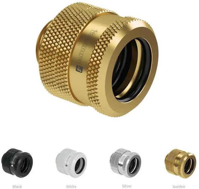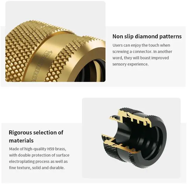 Wide FitEquipped with standard G1/4" threaded ports and designed for 14mm OD hard tubes, precisely machined ports ensure a perfect fit. Offers broad compatibility with mainstream hard tubing like PETG, Acrylic and Copper. ^^ DurableConstructed from high-quality brass with a special coated surface, providing excellent rust and corrosion resistance for long-term durability. ^^ Leak-Proof SealFeatures a built-in high-quality O-ring for reliable compression sealing, effectively preventing coolant leakage and ensuring safe and stable system operation. ^^ Quick InstallationSecurely install with a simple rotation, significantly simplifying hard tube loop assembly and saving time and effort.