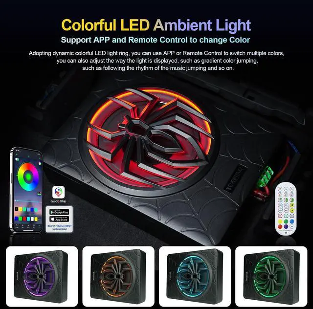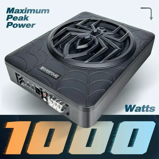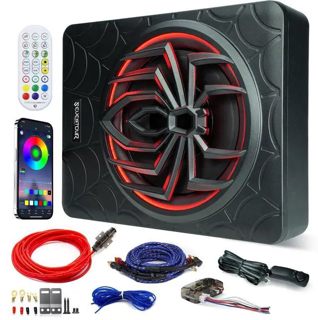 Seventour ST-1000C 10 inch Ultra Slim Under Seat Active Powered Car/Truck Subwoofer with Built-In Amplifier, Enclosure made of cast aluminum for excellent heat dissipation and reliable performance. ^^ This is a new 2024 upgraded car subwoofer audio that features a personalized spider speaker protector as well as a speaker Colorful LED ambient light ring design. When the car is started, the subwoofer lights up with Colorful LED lights. Make your car look more cool and dynamic. ^^ This ST-1000C car subwoofer includes wired bass volume remote control. With gain, bass boost and crossover controls, peak