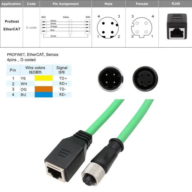 • M12 cable is widely used in sensor, machine vision image sensor camera system, barcode scanner reader, actuator, encoder, industrial Ethernet, network, outdoor LED display, rail transit CCTV control system, industrial automation control, servo, motor, robot, fieldbus, EtherNet/IP, profinet, EtherCAT, switches, router, PC host computers, PLC, process control, PoE injector power