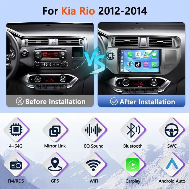 Compatible Models & Easy InstallThe easy-to-install car stereo system designed specifically for Kia Rio 2012 2013 2014. With a user-friendly interface and straightforward installation process, you can easily replace your existing stereo system with our compatible unit! This for Kia Rio car radio stereo offers a seamless upgrade to your vehicles audio experience, providing enhanced sound quality and a range of features to elevate your driving experience! ^^ Android 13 System Head UnitWith 4-core, 4GB of running memory and 64GB of storage memory, youll have ample space for all your favorite music, videos, and apps.