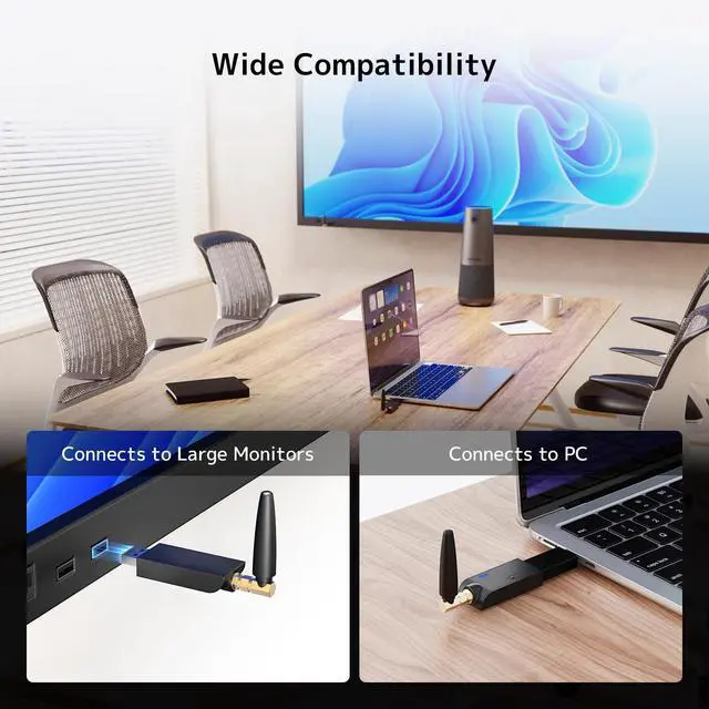 Plug & Play: With plug-and-play via power adapter and WiFi adapter, setup takes only seconds no IT expertise required. ^^ Wireless Freedom, No Cable Install: Skip messy wiring and costly installs, start meetings in seconds, cable-free.