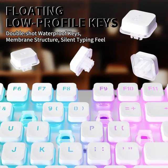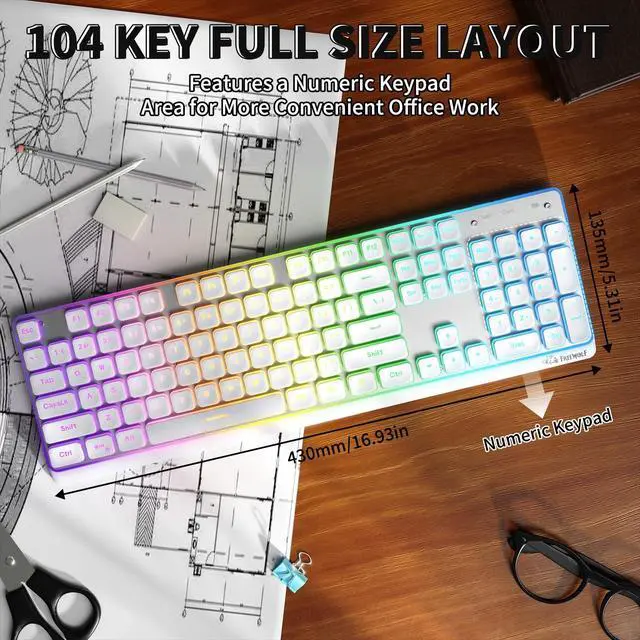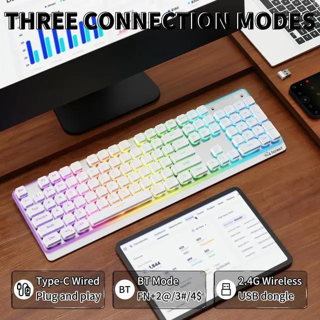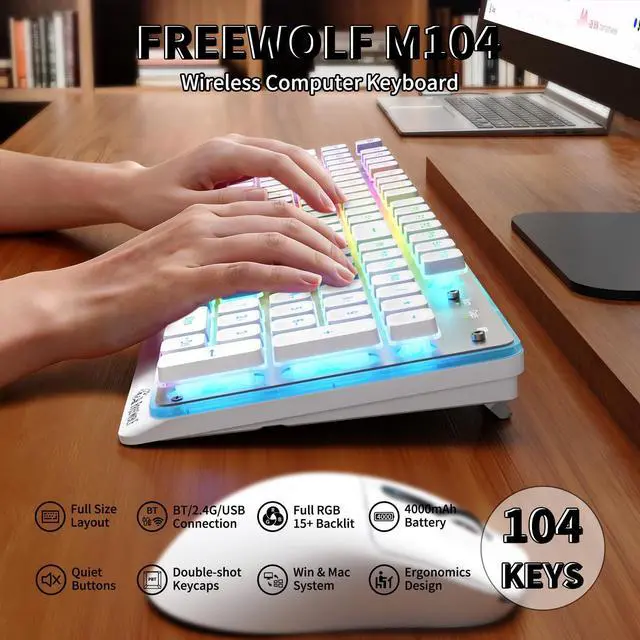 Ultra-Low Latency Triple-Mode Wireless Keyboard The M104 wireless keyboard delivers ultra-low latency performance with 2.4G wireless, Bluetooth, and USB Type-C wired connections. Easily switch between devices for home, office, or gaming use. The built-in 4000mAh rechargeable battery provides long-lasting power, making this a reliable rechargeable keyboard for PC, laptop, and Mac users. ^^ Full-Size 104-Key Keyboard with Silent Low-Profile Keys Designed for productivity, this full-size keyboard features 104 quiet, low-profile membrane keys and a dedicated numeric keypad for faster data entry. The spill-resistant keyboard design helps protect against accidental coffee or water spills, while double-shot keycaps ensure long-lasting, fade-resistant legends.