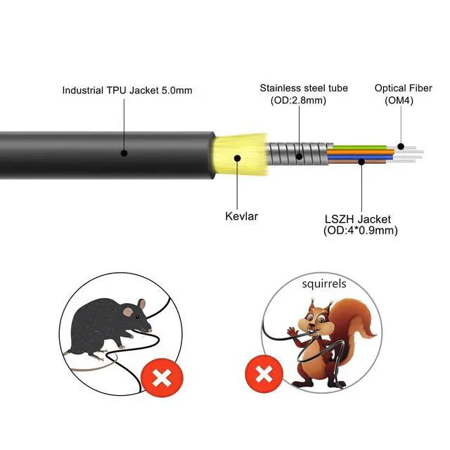 The OM4 fiber cables support bandwidths of up to 100 Gbps, ensuring reliable and efficient connectivity for your network needs ^^ 5.0 mm Outer Diameter LC Duplex Outdoor Fiber Optic Cable: With a larger diameter compared to 3.0 mm cables, the thicker 5.0 mm cables are suitable for environments where the cable might be subjected to more wear and tear