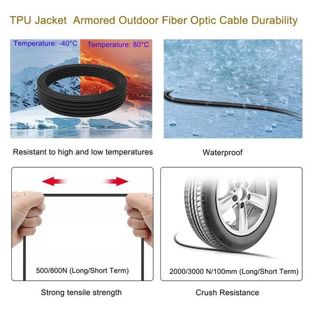 The OM4 LC outdoor fiber optic patch cable, with an industrial TPU jacket, is designed to be strong in tensile strength, highly wear-resistant, waterproof, and capable of enduring high and low temperatures. It is also UV-resistant and bend-resistant ^^ The OM4 fiber optic cable is suitable for various harsh installation environments such as roads, snowfields, industrial fields, and construction sites. It can be installed overhead, buried directly in the ground, or routed through conduits ^^ The OM4 outdoor armored fiber patch cable uses a stainless steel spiral armor tube to provide sturdy protection for the inner core (glass fiber) against damage from rodents and other external factors ^^ OM4 Patch Cable LC to LC is engineered for high-speed data transmission.