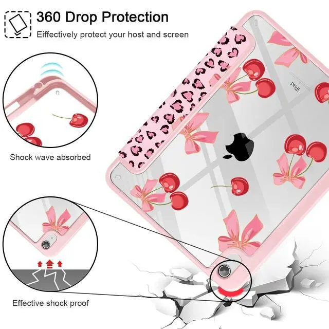 May Chen for iPad (A16) 11th Generation Case 11 Inch 2025, iPad 10th Gen Case 2022 10.9 inch, Built-in Pencil Holder with Clear Transparent Back Shell Auto Wake/Sleep, Pink Leopard & Cherry