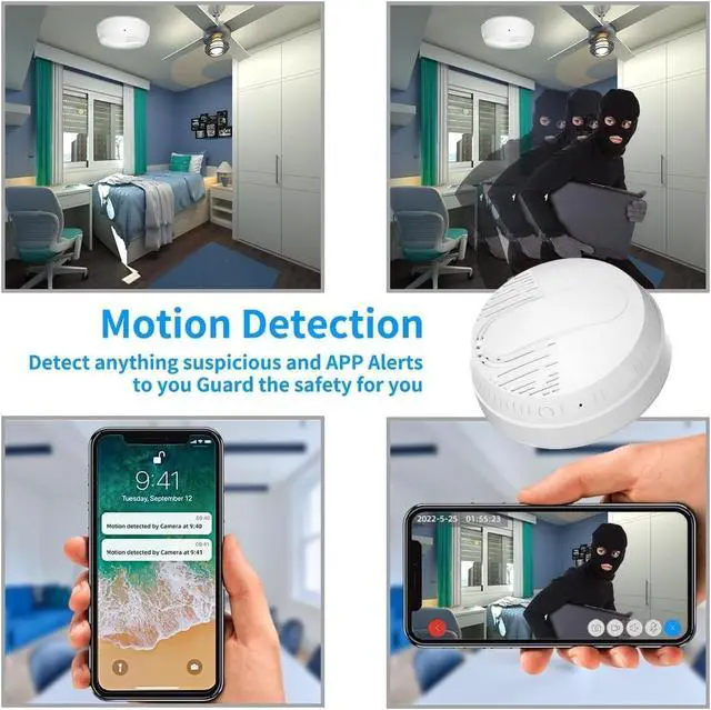Storage Loop: The smoke detector cam detects movement and sends real-time app alerts, supports up to 256GB microSD cards with auto-overwrite for non-stop use, ensuring you never miss home anomalies and effortlessly capture intrusions or family emergencies. ^^ 1080P HD & 150